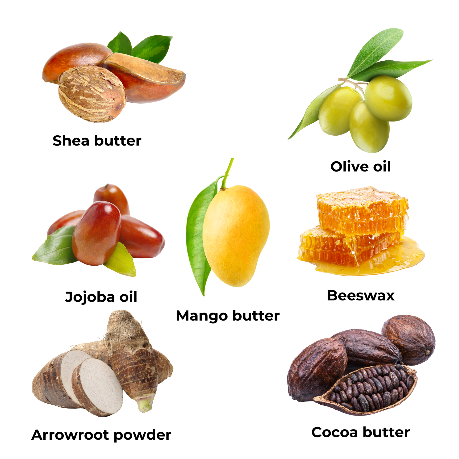 Ingredients: Shea butter, cocoa butter, mango butter, jojoba oil, almond oil, olive oil, vitamin E, beeswax, arrowroot powder