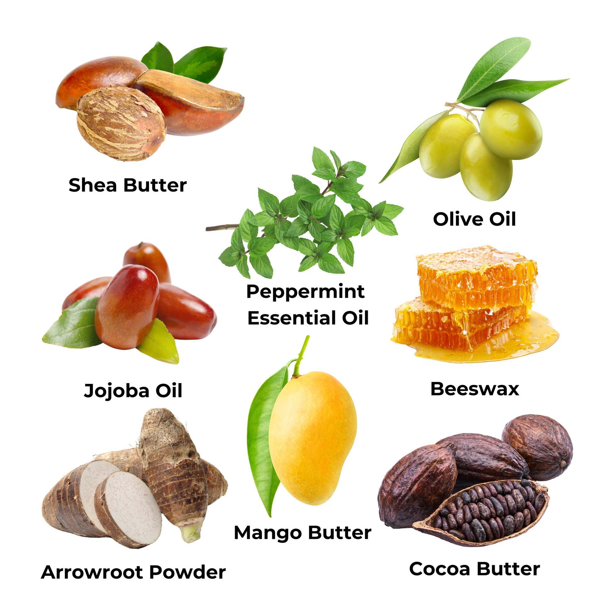 Ingredients: Shea butter, cocoa butter, mango butter, jojoba oil, almond oil, olive oil, vitamin E, peppermint essential oil, beeswax, arrowroot powder